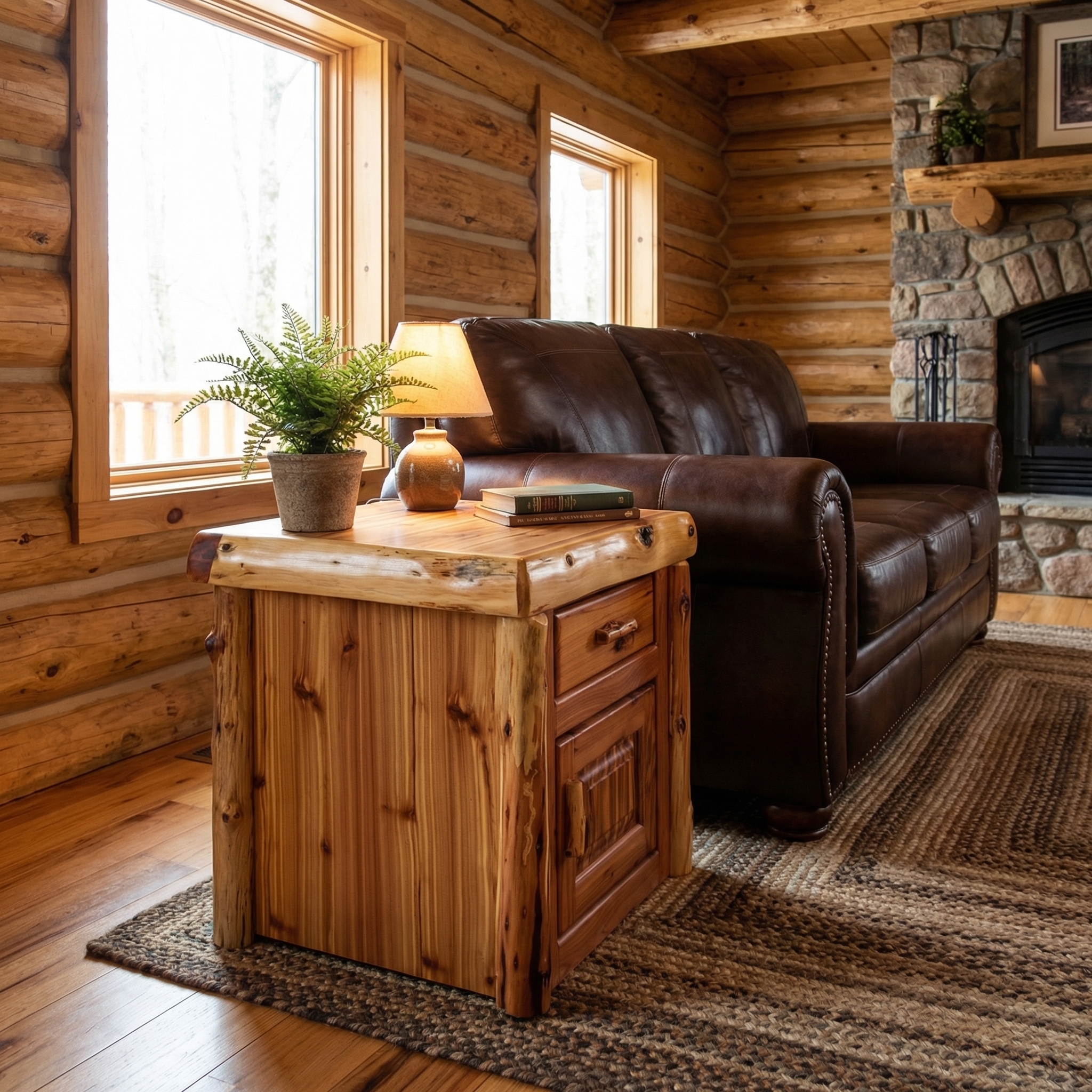 Shop cedar log end tables handcrafted from northern white cedar for cabins, lake homes, lodges, and rustic living spaces.