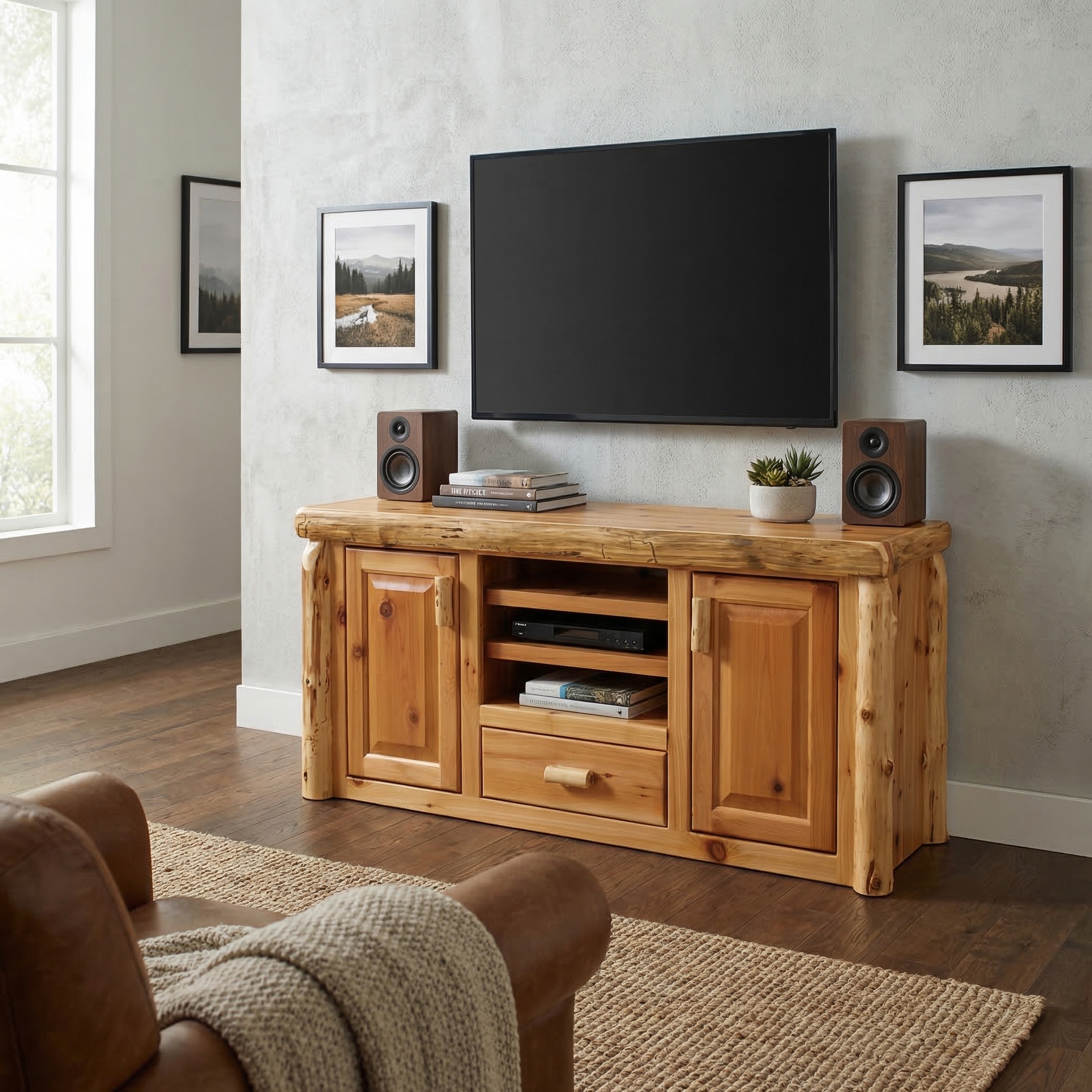 This collection features handcrafted entertainment furniture designed for cabins, lake homes, lodge-style interiors, and rustic living spaces that need both media storage and natural character.