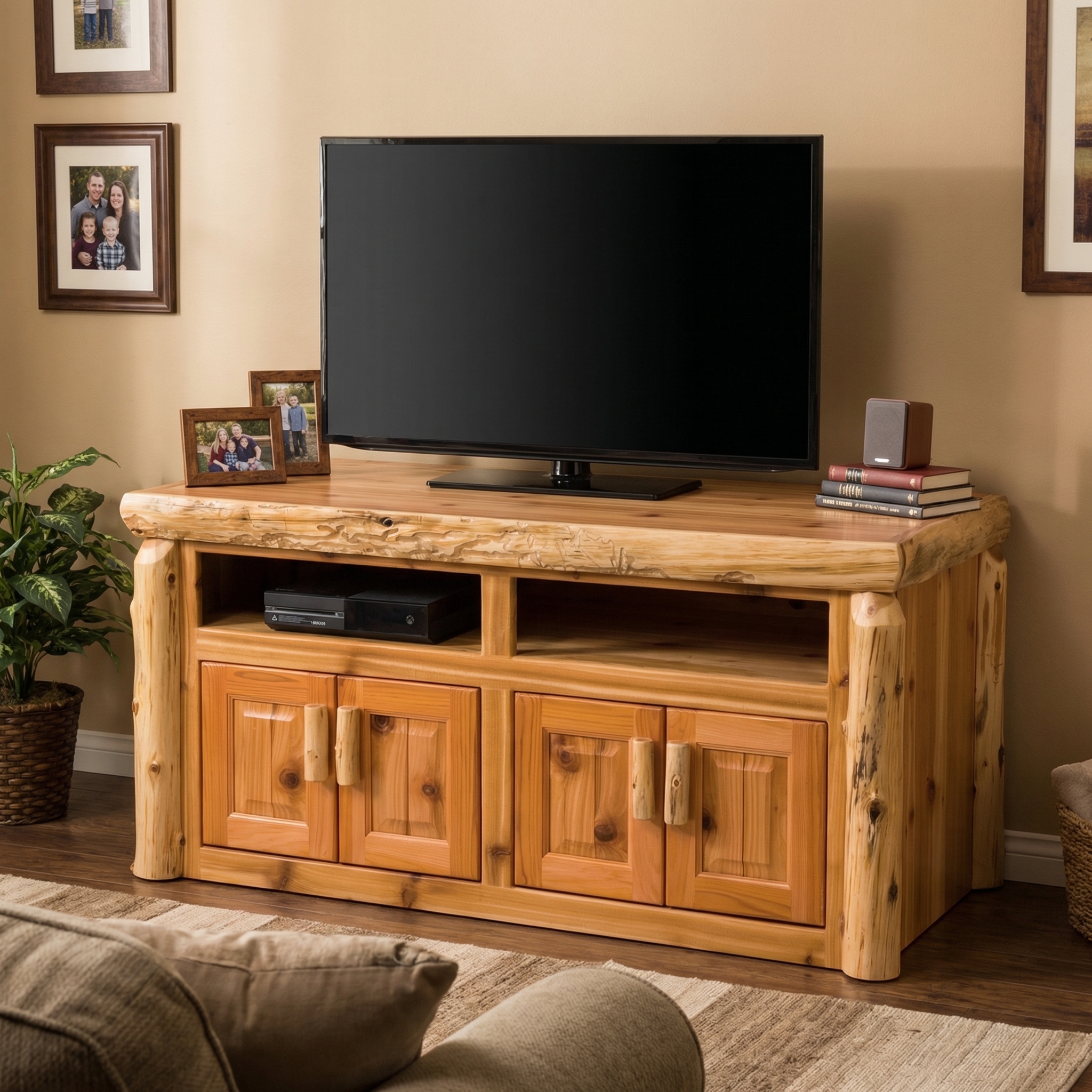 Shop cedar log TV stands handcrafted from northern white cedar for cabins, lake homes, lodges, and rustic living spaces.