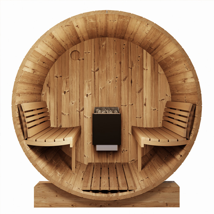 Bathing comfort cannot be overlooked when investing in an outdoor sauna barrel. The diameter of the barrel and the bench/backrest configuration must be considered. Barrels with a small diameter may be priced lower (less materials), but the tradeoffs are door height, bench comfort, and headroom. Smaller diameter barrels have a tighter arc which can create seating posture challenges, impact standing upright, and require one to duck upon entry and exit. ERGO Series Sauna Barrels benefit from a 6’5” interior height. Due to its large diameter, benches can be ergonomically contoured and formfitting. The generous barrel arc can support an expansive and arched backrest for true lumbar support. Touch and feel were not ignored when selecting the knot-free, silky-smooth grade-A Thermo-Aspen seating material designed to hug most any body size.