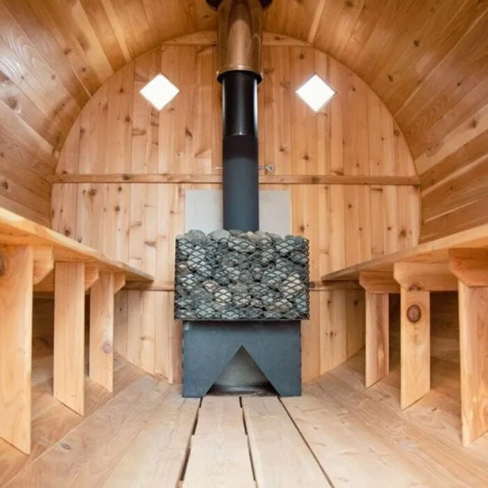 Each barrel sauna arrives with an external fed Setri Barrel wood stove that is installed with piping directly out the top of the stove internally.