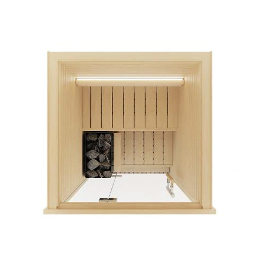 Compact indoor premium sauna with full glass front, ergonomic benches, and clean Scandinavian design.