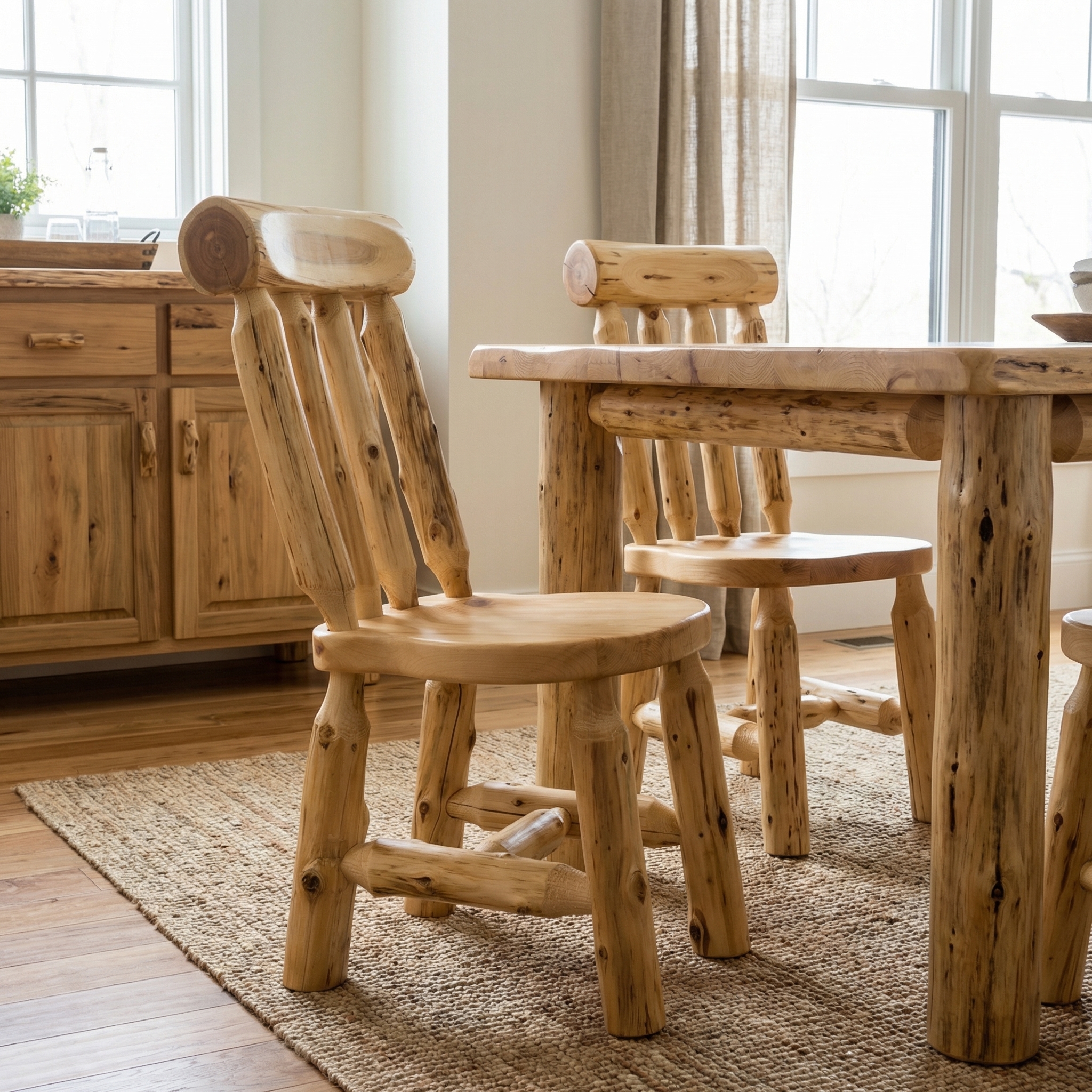 Bring the warmth of the north woods into your home with a handcrafted cedar log chair designed for rustic dining spaces, cabin retreats, and lodge-style interiors.