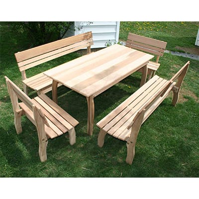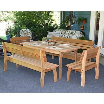 | Components | One Cedar Dining Table, Two Backed Benches (32″L each), Two Backless Benches (match table length) |
