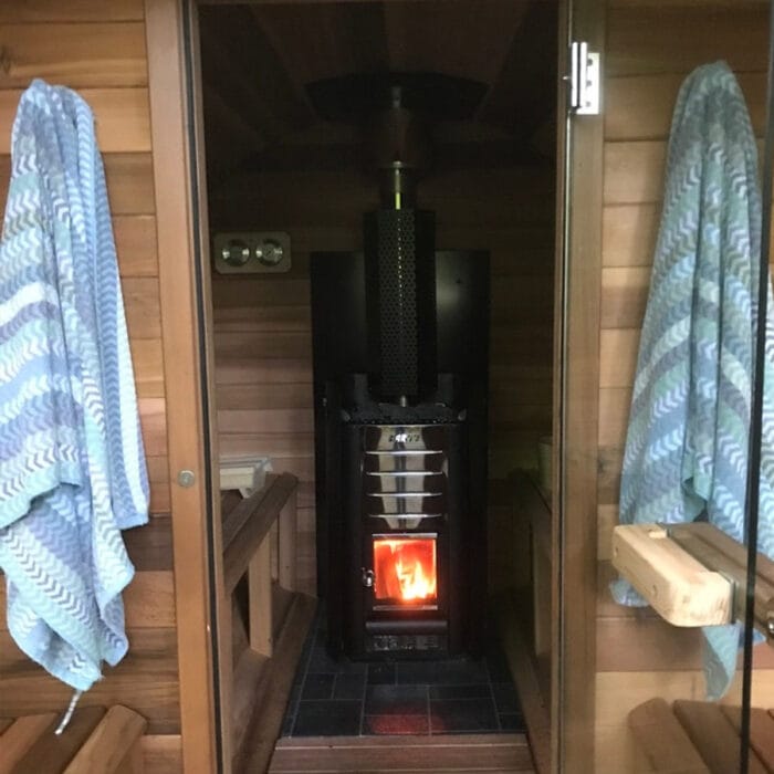 While someone is enjoying the heat in the sauna room another bather can be relaxing in the next room while appreciating the glow of the flames behind the cast-iron-framed glass door.