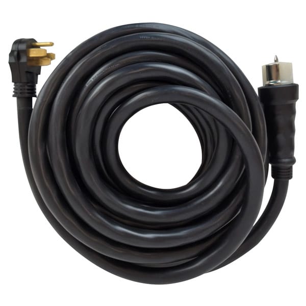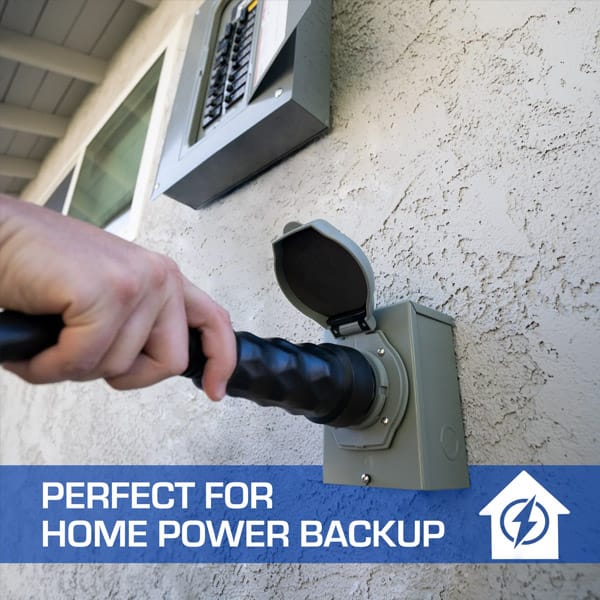 This generator power cord features a 100% copper wire for better power quality, an STW jacket rating for durability, grounded plugs for safe operation, reinforced blades minimize bending of prongs, and standard CS6364 to hook directly to most 50 amp transfer switch types.