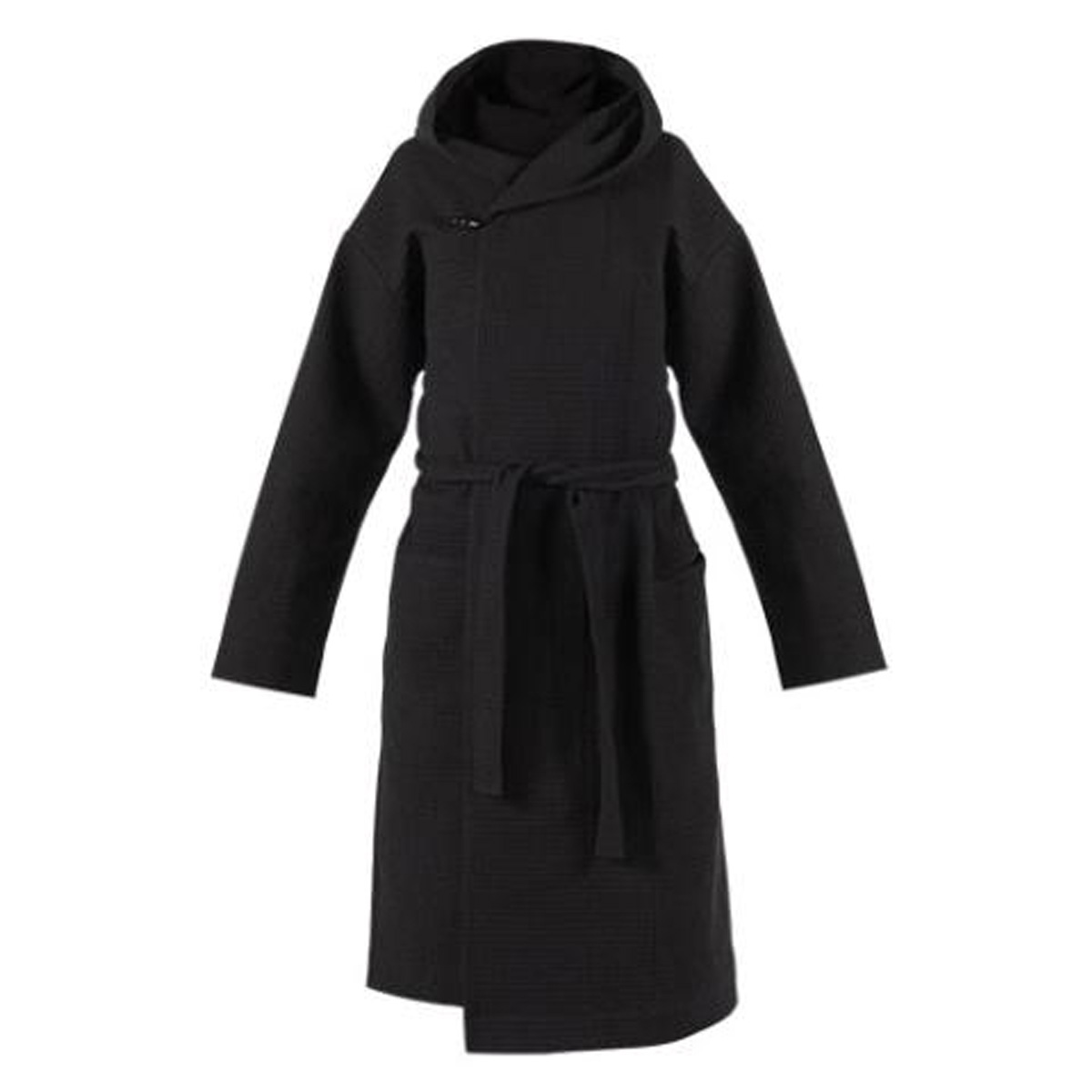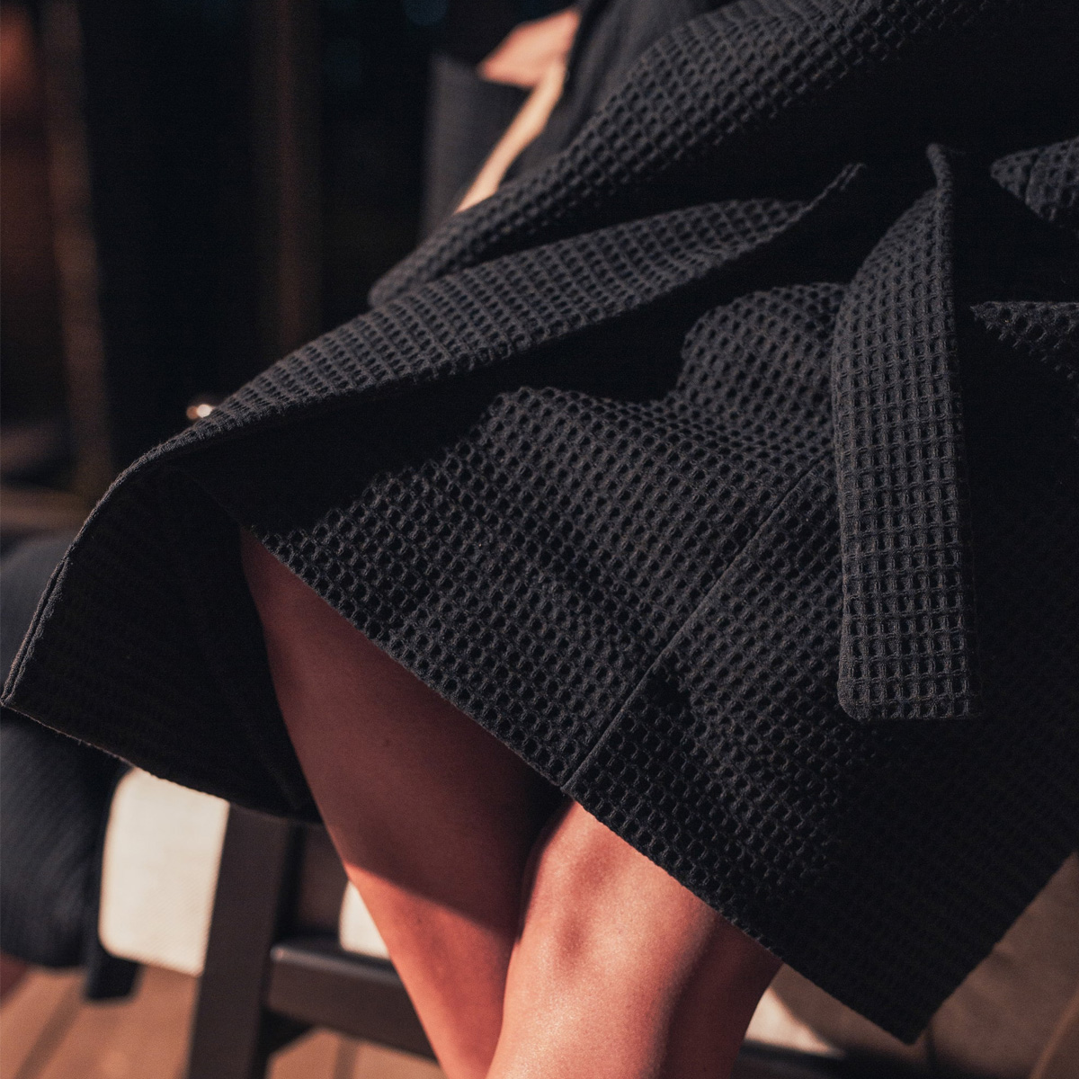 This black, hooded robe can be worn before, during, and after your sauna session.