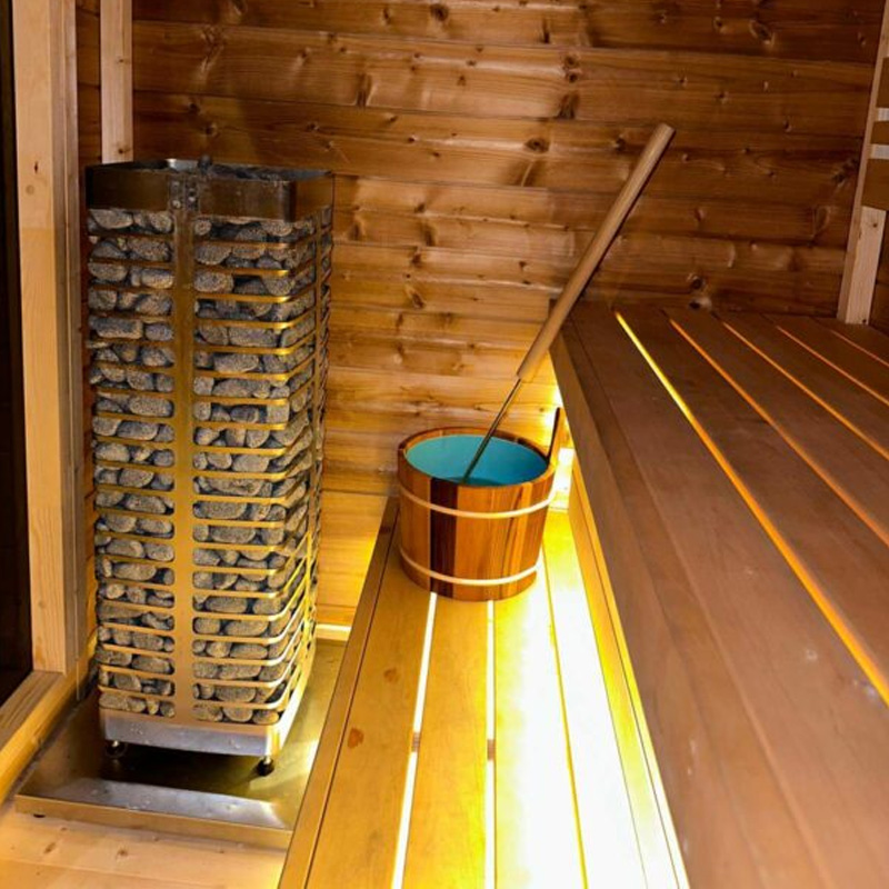 This maximizes the proportion of beneficial negative ions in the air, which is also high in the traditional wood-heated sauna.
