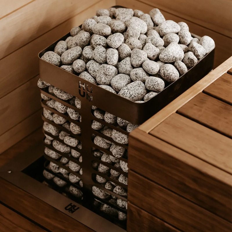 It’s recommended to use round sauna stones in HUUM sauna heaters. Round stones complement the design of the heaters and provide milder steam.