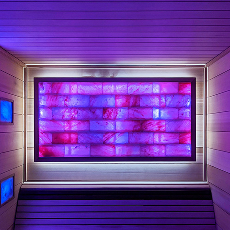 A salt wall adds architectural contrast to wood interiors and elevates the entire sauna experience.