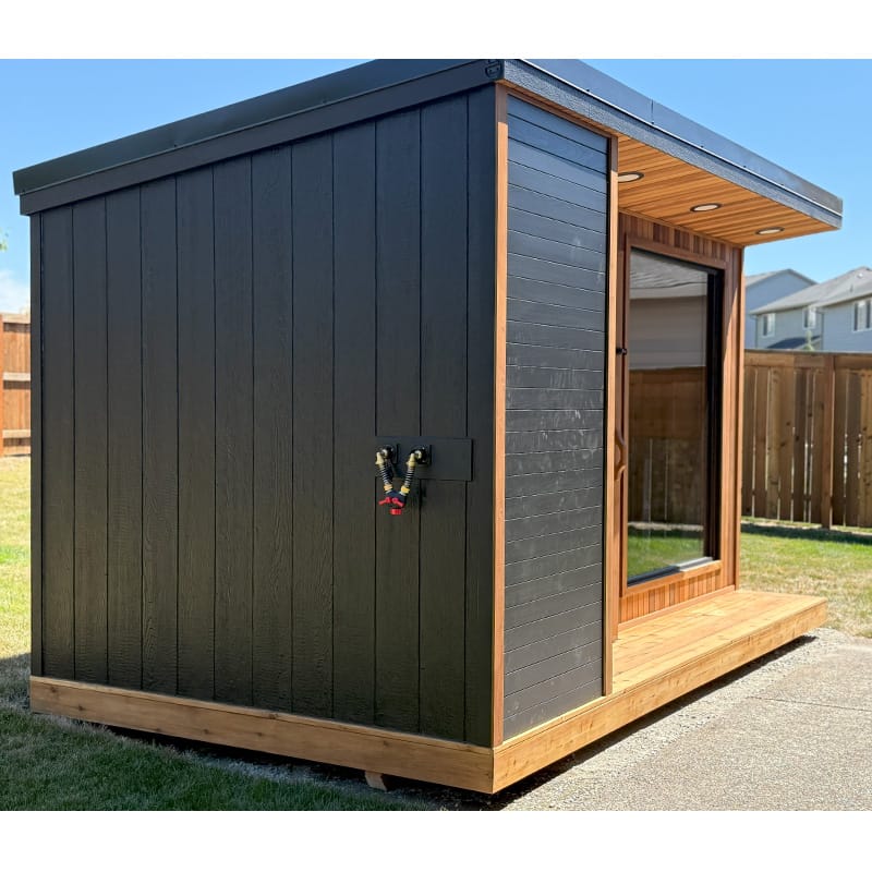 Step into pure relaxation with the Cold Creek — a handcrafted 8′ x 14′ luxury outdoor sauna featuring a fully enclosed cedar changing room for added comfort and convenience.