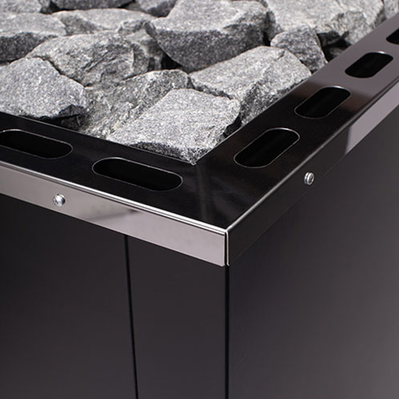 The sturdy outer casing of the sauna stove is painted in black for a bold appearance.