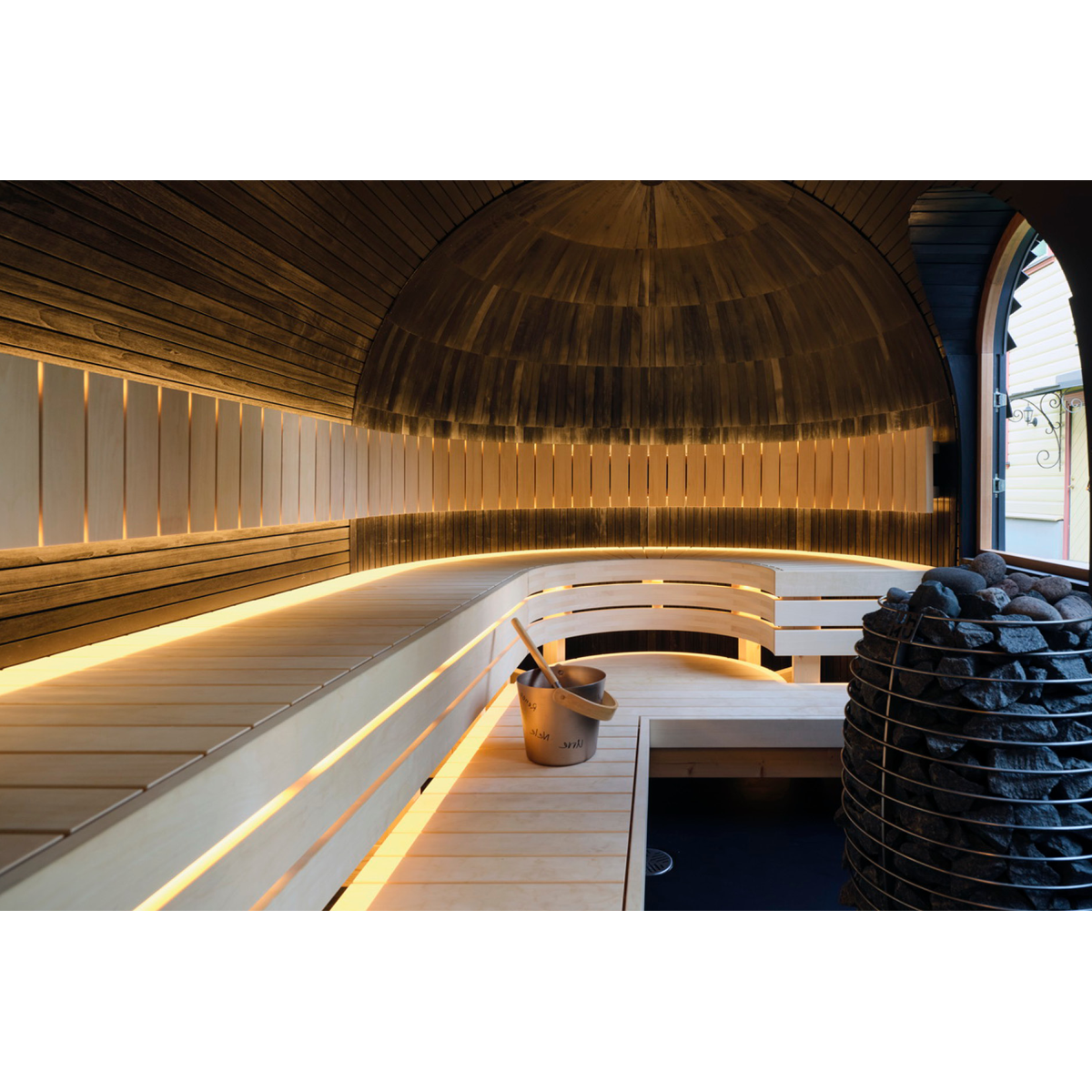 The round structure encourages natural air movement, helping maintain even, comfortable heat throughout the sauna.