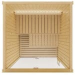 The tempered glass full front wall showcases silky-smooth, furniture-grade Aspen benching and backrest which are surrounded by bright and welcoming Nordic Spruce walls and ceiling.