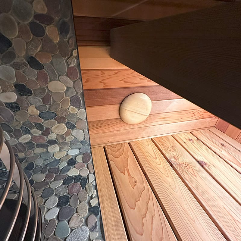 - Heater Enhancement – Placing rock tile around the heater draws visual focus to the heart of the sauna, elevating its design while emphasizing the sauna’s central source of heat and relaxation.