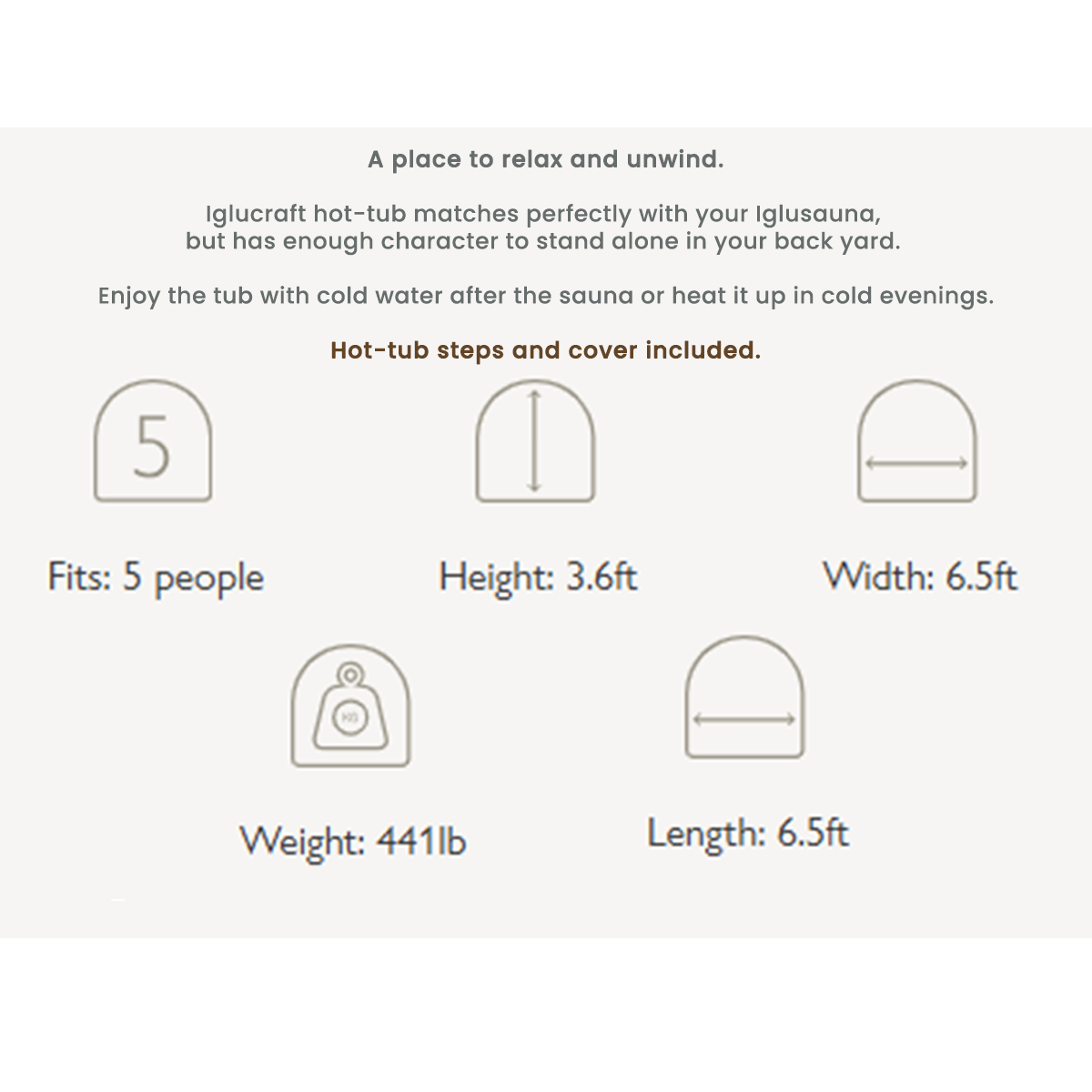 The Iglucraft model comfortably seats up to five adults, making it ideal for families or small gatherings in an outdoor tub setting.